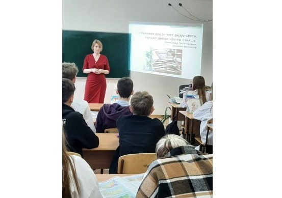 В рамках акции перед учащимися выступила выпускница школы, учитель географии, номинант муниципального этапа конкурса «Учитель года 2022», подготовившая призёра республиканского этапа Всероссийской олимпиады школьников по географии Биккулова Л.В..
