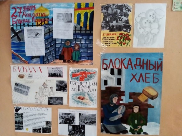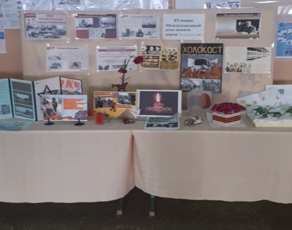 24 января 5-11е классы оформили в школьном коридоре стенд и инсталляцию посвященных Дню памяти жертв Холокоста и Блокаде Ленинграда.