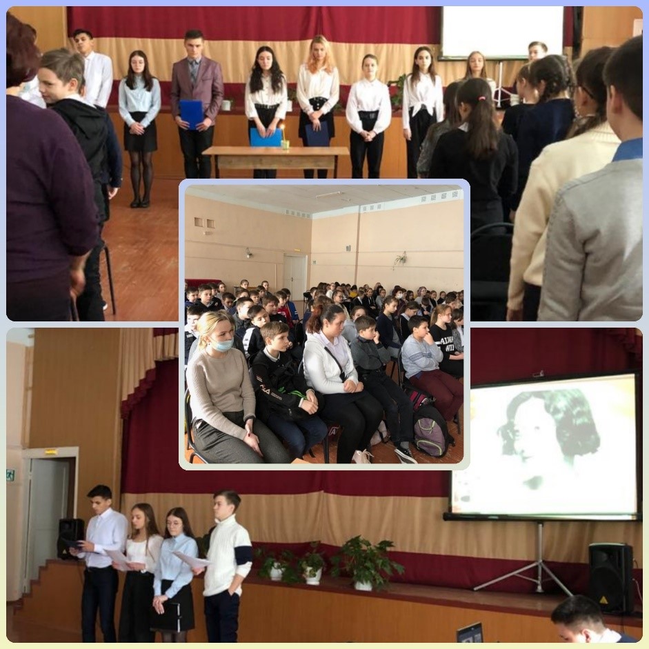 26 и 27 января проводятся уроки памяти, посвященный Дню памяти жертв Холокоста, которые подготовили 11а и 8г классы для 5-7 классов. Подготовленный материал о событиях соответствовал возрастным особенностям учащихся. Мероприятие способствовало формированию у учащихся ознакомление с историей концлагеря Освенцим, как трагической страницей периода Второй мировой войны, формирование толерантного сознания, демократичных и гуманных взглядов.