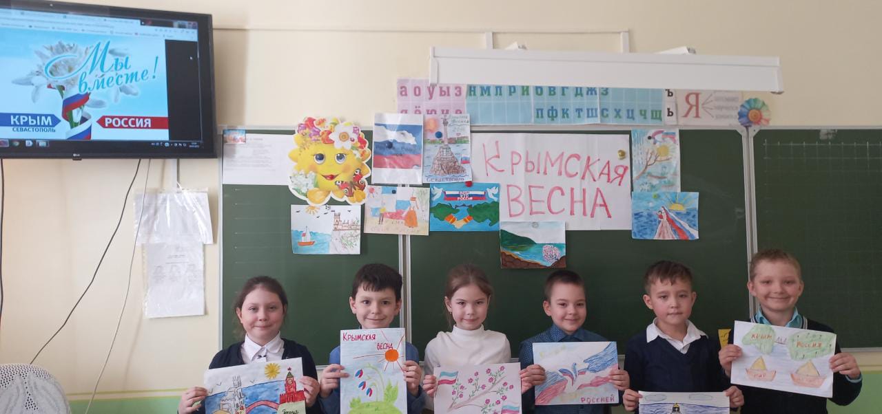 В начальных классах прошли уроки – презентации. Учитель рассказала об истории Крыма, о событиях, приведших к всенародному референдуму в Крыму и о создании Крымской Республики. Учащиеся получили сведения о географическом положении Крыма, о его историческом и культурном прошлом. Были проведены заочные путешествия по местам Крымского полуострова, по итогам которых выполнены рисунки. Школьники оценили значимость такого события в истории нашей страны.