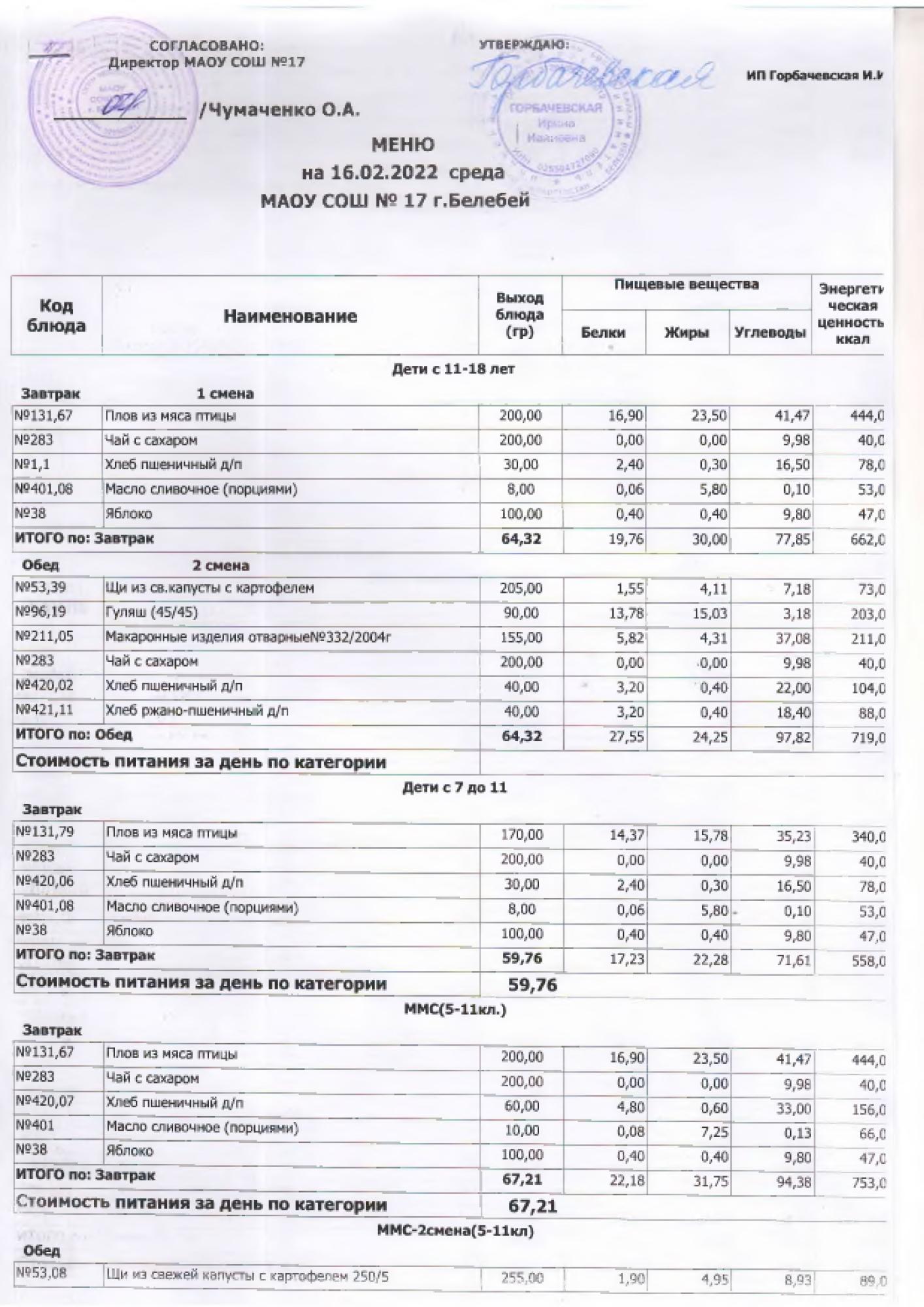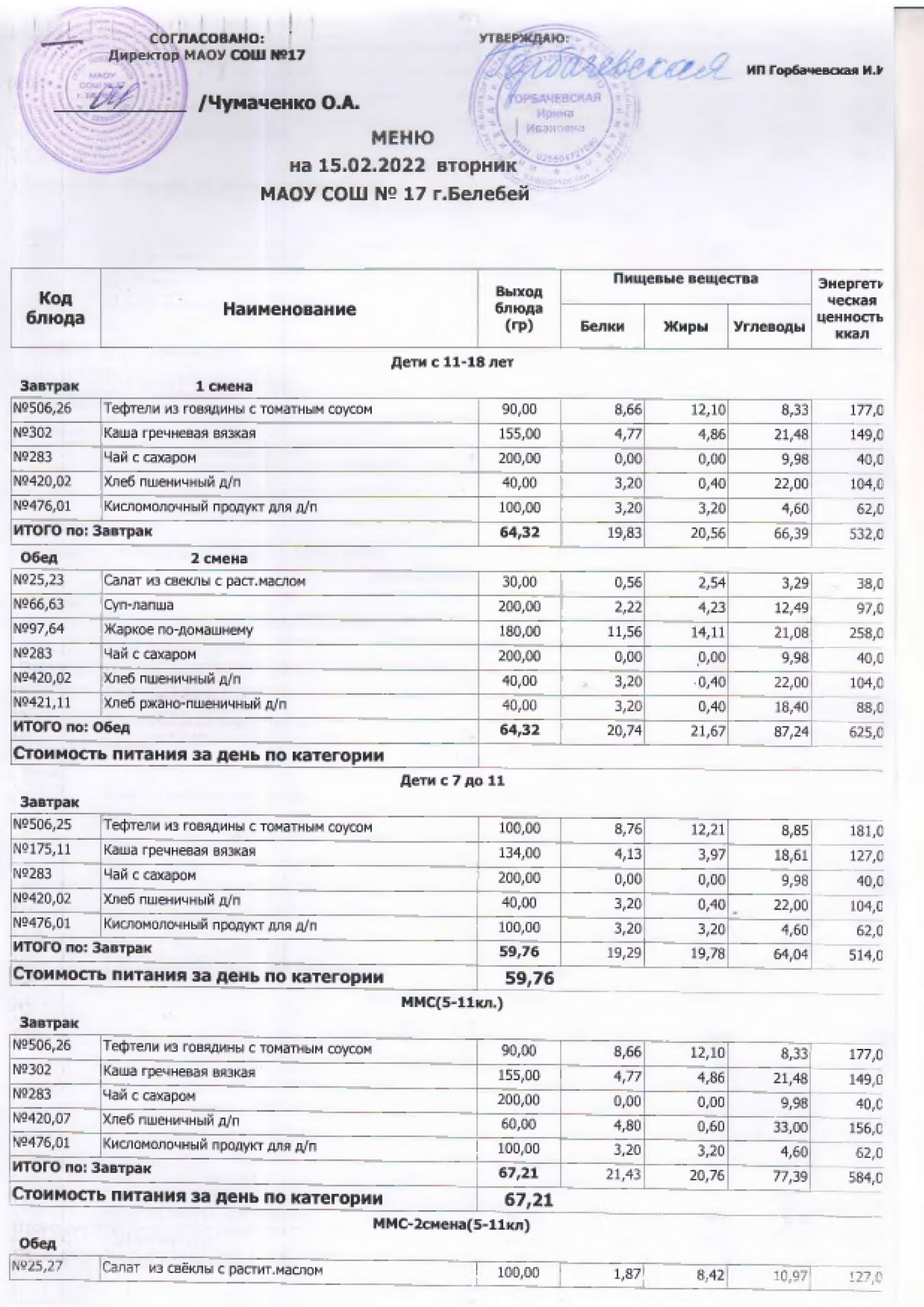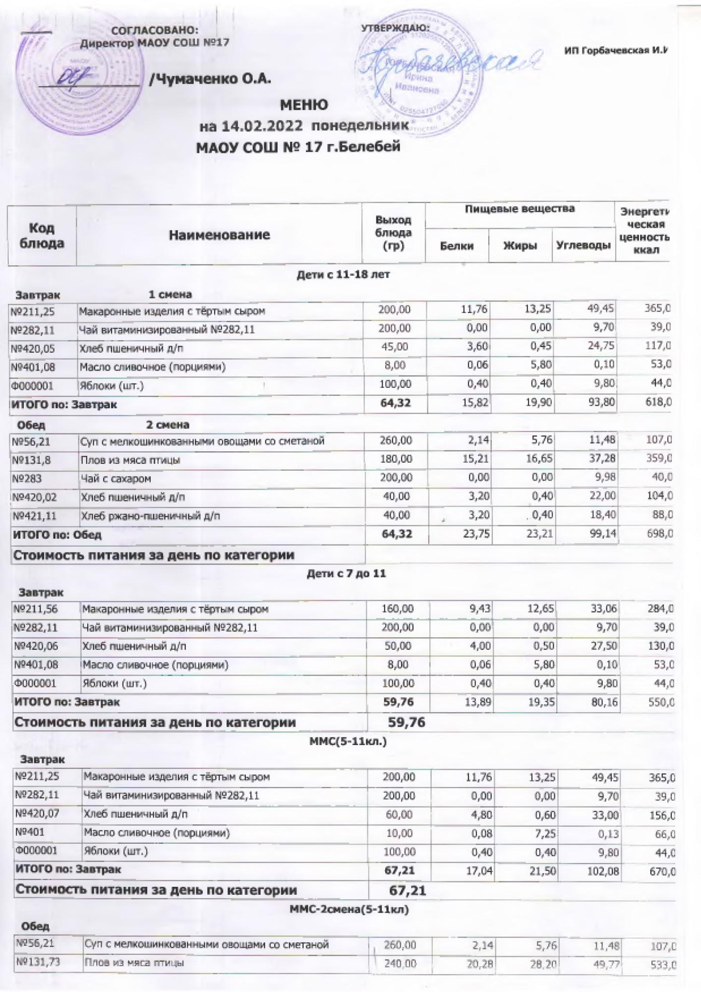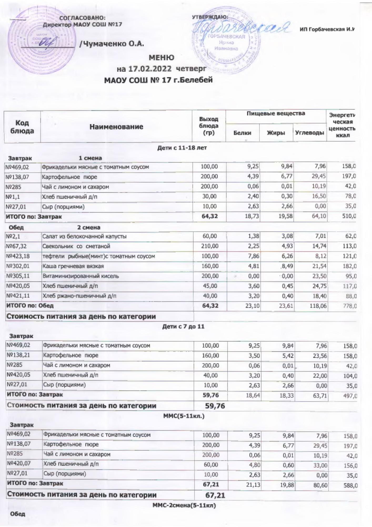 В данном разделе ежедневно размещается фотографии меню и контрольных блюд.