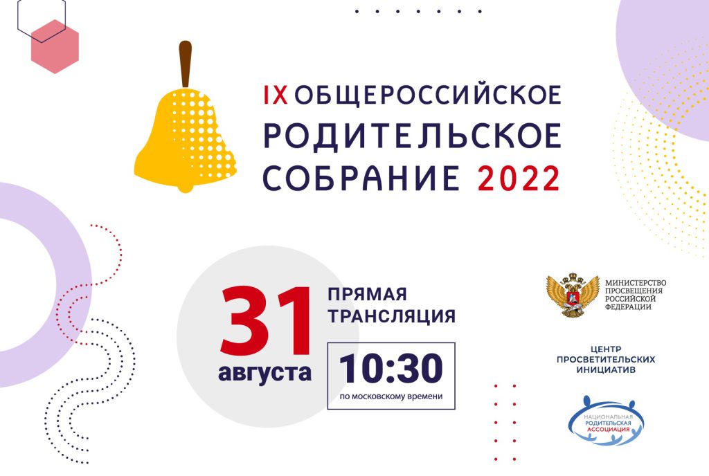 31 августа 2022 года в 10.30 (по московскому времени) состоится IX Общероссийское родительское собрание, в ходе которого Министр просвещения Российской Федерации Кравцов С.С. ответит на вопросы родителей школьников, поступившие на сайт и в официальные сообщества социальных сетей Минпросвещения России.